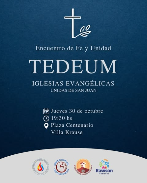 Este jueves 30 de octubre te invitamos a participar del Tedeum de las Iglesias Evangélicas Unidas de San Juan. Un espacio para compartir la fe, la esperanza y la unión de nuestra comunidad. 🙏🏻
