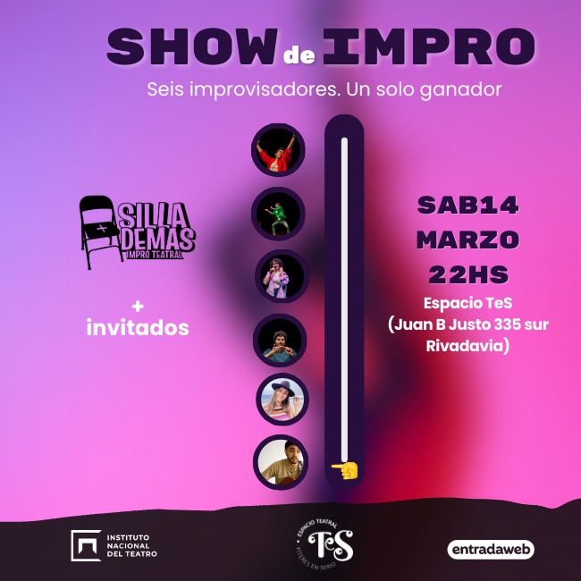 Vuelve la temporada de impro de SILLA DEMÁS al Espacio TeS. 6 improvisadores competirán entre sí para crear la mejor historia improvisada de la noche. Sólo uno de ellos podrá ganar: el mejor, el favorito, el elegido por el público. Un show único, con juegos y desafíos nuevos que deberán sortear en sus historias mientras van creando las mejores escenas improvisadas de la noche